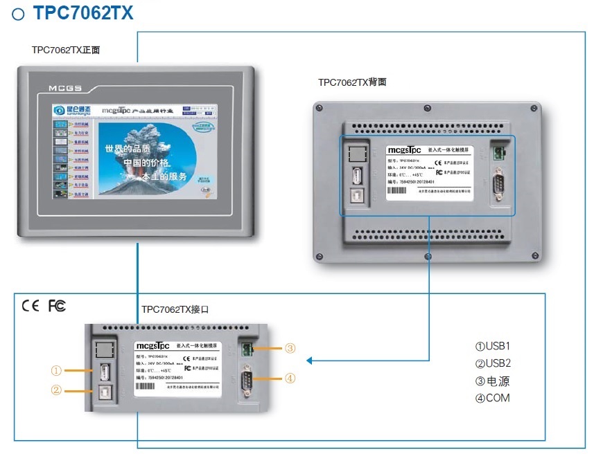 TPC7062TX,是一套以先進的Cortex-A8 CPU為核心(主頻600MHz)的高性能嵌入式一體化觸摸屏。該產品設計采用了7英寸高亮度TFT液晶顯示屏(分辨率800×480),四線電阻式觸摸屏(分辨率4096×4096)。同時還預裝了MCGS嵌入式組態軟件(運行版),具備強大的圖像顯示和數據處理功能。