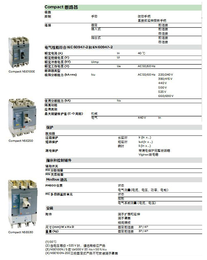 Compact NSE 系列塑殼斷路器適用于交流 50/60 Hz,額定工作電壓 690V(1),額定電流 15 至 630 A 的配電網絡中用于分配電能和保護線路,電源及用電設備免受過載和短路的危害,提高了供電的可靠性與連續性。