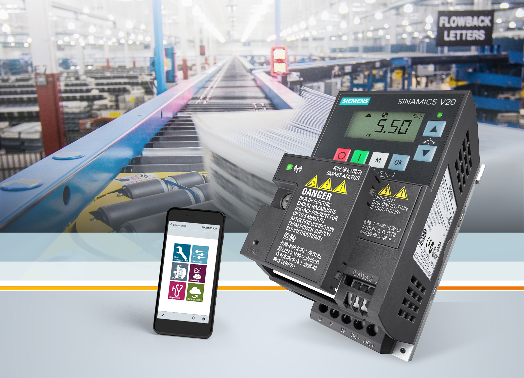 Sinamics V20 Smart Access智能連接模塊使不同行業的客戶可以通過各種移動設備訪問Sinamics V20變頻器。由于內置網頁服務器,無需安裝額外程序,可直接使用現有的網絡瀏覽器。因此,客戶可以自由選擇無線設備。利用Sinamics V20Smart Access智能連接模塊可直接執行以下功能:調試、設置或修改參數、監控變頻器狀態、運行電機、故障排除、備份或還原設置等。來自一臺變頻器的設置可以下載并發送至其他移動設備。將智能連接模塊安裝在不同的驅動上,用戶可以將自己的智能手機作為操作面板,對不同的驅動進行調試和操作。通過便捷的接入和直觀的用戶界面可實現快速、輕松的調試以及參數設置。此外,該工具可以讓用戶在故障報警后得到提示信息,并隨時修改參數。